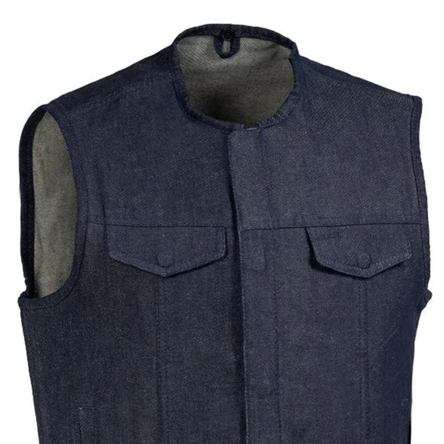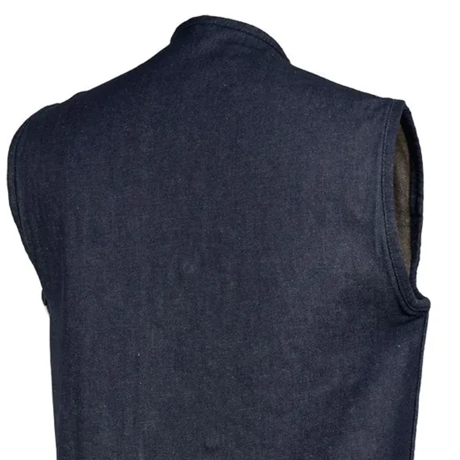 The Haywood is a Rough Neck Raw Denim club style vest with a roll up collar, covered snaps and a cropped center zipper. It has our conceal carry pockets, and an unlined raw denim interior.