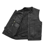 Looking for a clean, classic club style vest? The Hot Shot has a banded collar, covered snaps and covered, cropped center zipper. Four pockets up front, and a single panel back with two conceal carry pockets. It’s got a mesh lining, with easy access panels for adding patches and embroideries. It’s also got blacked out zippers for a uniform look.