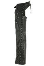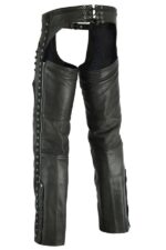 The Wind Alexis Women’s Motorcycle Leather Chaps are made of soft, premium drum-dyed naked goat leather 1.0 – 1.1mm, which combines durability and elegance. They are created for both elegance and practicality, featuring grommet details and lacing accents for a striking appeal. The flexible inner thigh panels provide optimal riding comfort, and the satin underpinning is versatile in both hot and cold conditions.