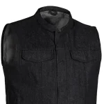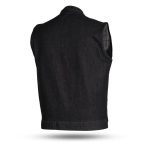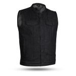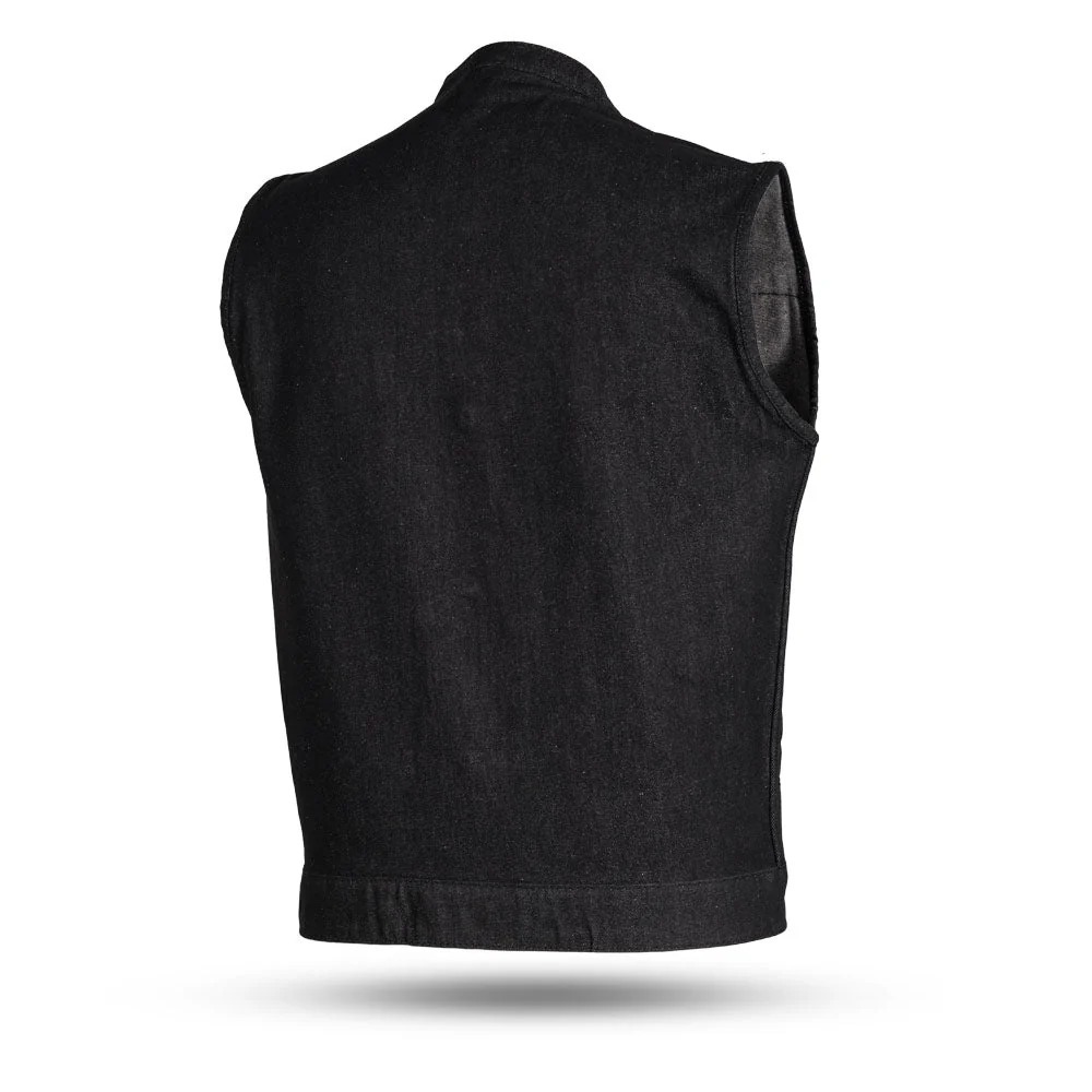 The Kershaw is a club style vest in our Rough Neck Raw Denim. It’s a club style vest with one inch banded collar and covered snaps. A cropped center zipper helps ensure the vest won’t ride up while you’re riding. Two conceal carry pockets, two chest pockets and two slash pockets for everything you need to carry. This one is unlined, and great for warmer weather or layering.
