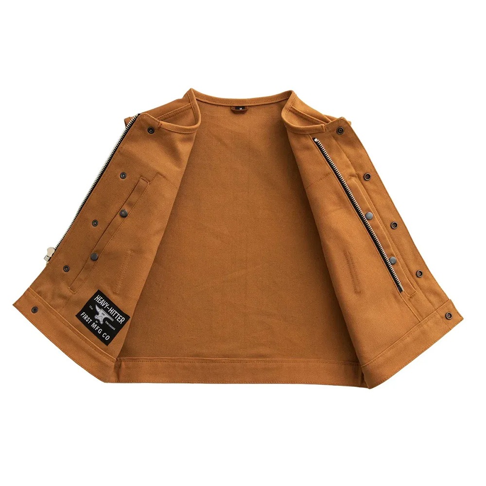 The Lowside is our most popular canvas vest in a proper club-style fit. This vest runs three inches SHORTER than an average vest, for more comfort when you’re on the motorcycle. After all, who wants your vest ballooning up around your shoulders? This one won’t! It also runs a half size smaller for a tighter fit. It’s got our conceal carry pockets, a rollup collar, and covered snaps. It’s unlined, so it’s great for riders in warmer climates, or layering.