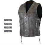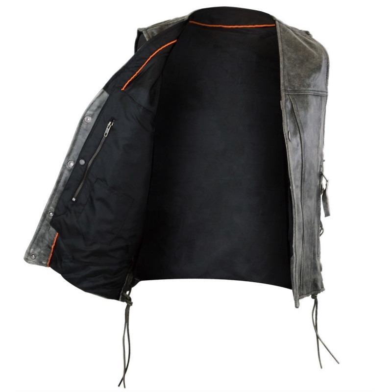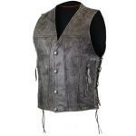 Our premium leather vest, featuring a unique cracker finish that combines rich grey and brown tones with elegant dark black shading. Designed for ultimate comfort, it boasts a pro comfort inner liner that enhances wearability. The vest is equipped with a secure button closure and an additional piece for layered styling. Numerous interior pockets provide ample storage for your essentials, making it the perfect blend of style and functionality for the modern rider.