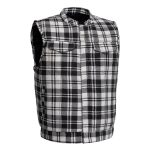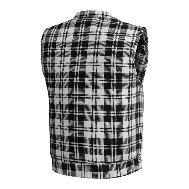 Crafted from durable 14oz recycled water repellent canvas, this club-style vest blends rugged construction with functional design. It features a cropped center zipper, a one-inch collar, and four snap-down pockets for a clean, classic look. Inside, two concealed carry pockets provide secure storage, while armor pockets are built to hold CE-rated protection. A single back panel up to 5XL allows easy customization, and the breathable mesh lining ensures comfort finished with heavy-duty YKK zippers for lasting reliability.